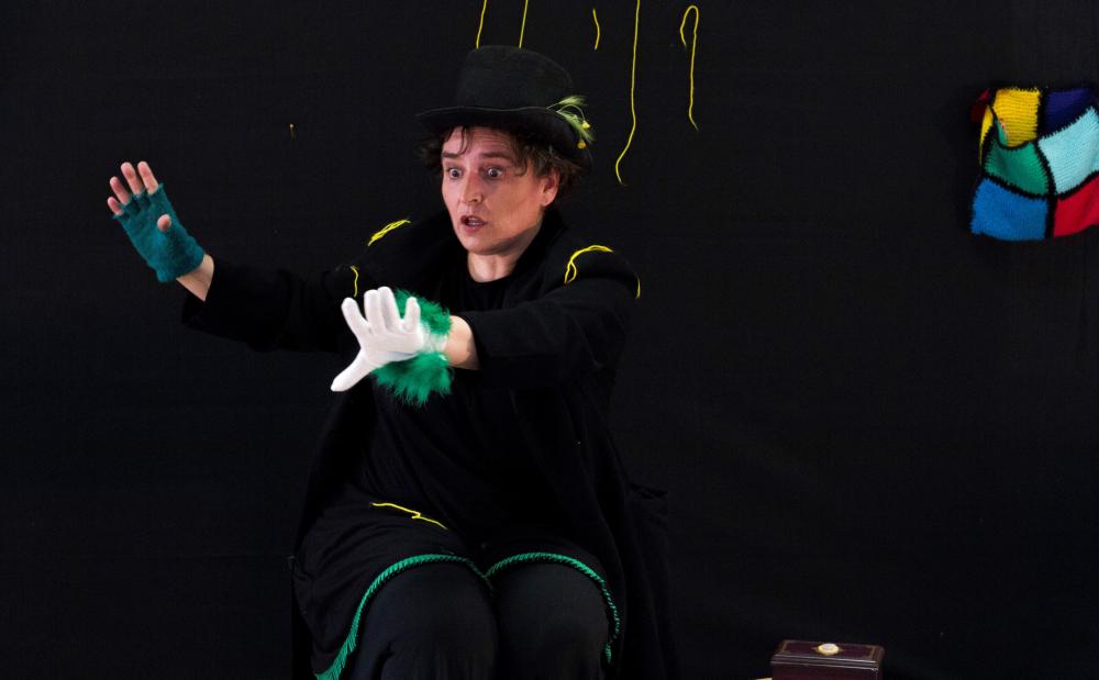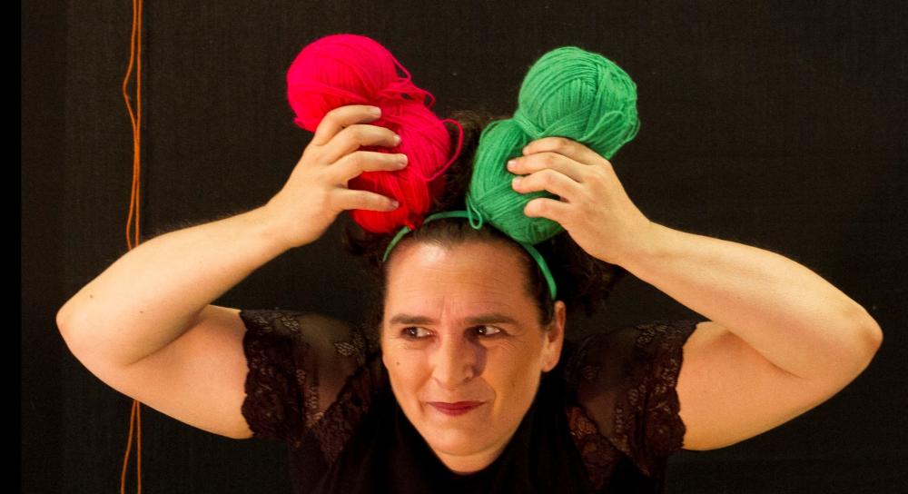 Espectáculo de cuentos de pequeño formato donde se ilustran las historias cosiendo con lanas de colores y materiales de costura como botones, agujas o alfileres sobre un lienzo negro. Coser, cantar y contar al tiempo.