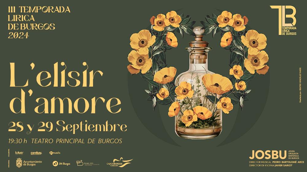 Sábado 28 y domingo 29 de septiembre de 2024 . 19:30 h. III TEMPORADA LÍRICA DE BURGOS 2024. ÓPERA. “L’elisir d’amore” (Música: Gaetano Donizetti. Libreto en italiano: Felice Romani). Joven Orquesta Sinfónica de Burgos. Coro de la Temporada Lírica de Burgos (director Juan Gabriel Martínez Martín). Dirección de escena: Francisco Javier Sariot Marquina. Dirección musical: Pedro Bartolomé Arce. Adina: Laia Vallés (soprano). Nemorino: Jesús Álvarez (tenor). Dulcamara: Jorge Tello (bajo). Belcore: Pablo Gálvez (barítono). Giannetta: Almudena Martínez (soprano). Teatro Principal de Burgos. Zona A: 30 €, Zona B: 24 €, Zona C: 15 €, Zona D: 12 € (+ comisión de venta por internet). Programación conjunta Ayuntamiento de Burgos y Fundación Caja de Burgos