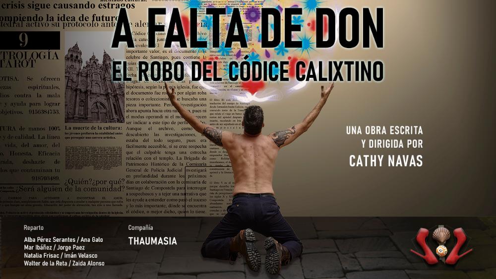 La noticia del arresto de don Jesús Fernández Castiñeiras, antiguo empleado de la Catedral, ha sacudido las calles en el día del aniversario del robo del “Códice Calixtino”. Un año antes, don Jesús llegaba consternado a casa por la noticia del robo. Al mismo tiempo, la inspectora Alma se trasladaría a Santiago para investigar los hechos. En el año en que tardará en resolverse, el caso del este robo se convertirá en escenario para las idas y venidas de algunos de los vecinos más pintorescos de la localidad. Todos ellos, directa o indirectamente, estarían relacionados con el caso del Códice…. “A falta de Don. El robo del Códice Calixtino” es una obra que trata las pasiones arquetípicas de la tradición dramática: el amor, el dinero y la venganza, situadas aquí en un contexto costumbrista y con el Don como pilar principal sobre el que se sostiene la relación entre sus personajes.