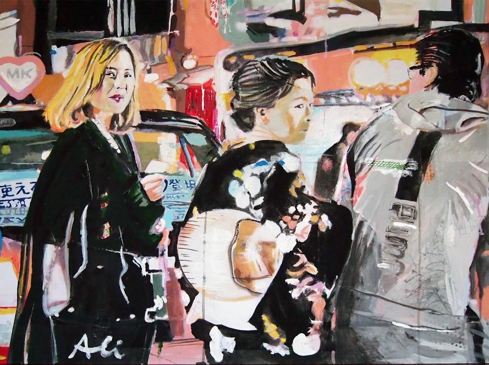 Brusca es la contraposición de estas con las ciudades de Ismael Alí, pues en la obra el color ya no se contiene, sino que desborda. La pincelada aporta materia, incrementada esta con los ensamblages. Esta ciudad está viva, ruidosa que carente de pudor nos muestra su vida. No se trata de mostrar el espacio, el tiempo, lo absoluto, lo grandioso. No, lo que valora Alí es la cotidianidad, y en esa vida salvaje, inoportuna, intensa, está la razón de ser de su representación de la ciudad. El pop art, y la obra de Ismael Alí, de necesitar clasificación lo sería sin duda en ese movimiento, acude al color vibrante, al paisaje reconocible, al código de la cultura contemporánea. Es el arte de lo urbano, de la civilización de la ciudad. Quizá por eso Ismael viaja de ciudad en ciudad buscando en todas ellas lo mismo: sus habitantes que todo lo llenan, su ruido que, magia, sale del cuadro que deja su silencio para cuando el espectador se va. Las ciudades de Alí nos interpelan, nos llaman, “eh, tú, fíjate lo que hay”. En ocasiones el lienzo en manos de Alí es un muro “grafiteado”, y salvaje, y nuestro artista deviene en un Basquiat inteligible y, en cierto modo, domesticado. Si algo destaca en ese maremágnum de color, es la abundancia de personas, en las que más que los rostros (en escasas ocasiones nos interpelan directamente, pues actúan entre ellos), cargan su definición en la ropas. Todos ellos habitantes de perspectivas bien construidas en avenidas y bulevares, esquinas de luminosos rótulos, picados magníficos como el la Salute en Venecia (volvemos a Venecia), o el de la 8th Av. y Central Park.