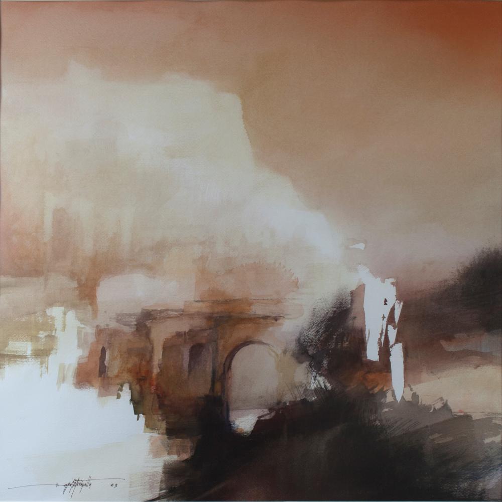 Esa magnífica estampa urbana es trasunto de las urbes de Rafa Mediavilla. La panoplia de vistas de ciudades, reconocibles algunas, escondidas otras, envueltas en brumas, nubes o lluvia racheada, son la constante de sus ciudades. Aparentemente inacabados acrílicos y acuarelas, de colores medidos, cuando no lavados, muestran una maestría en la técnica pareja a la capacidad creativa. El pintor, conocedor de esa tradición de la ciudad como objeto del arte de la que venimos hablando, estudioso de cuantos le precedieron, sin dejar de ser deudor de la tradición, no pretende repetir ni repetirse, y nos aporta bellas estampas cargadas de misterio y profundidad. Aquí una cúpula, allá un torreón o el trasunto de un canal, con esas ventanas de construcciones que se nos antojan desiertas o, al menos, cuyos habitantes no asoman apenas por no romper, con su ruido, la serenidad reinante. Complemento de todas ellas es el efecto “teleobjetivo”, la acumulación de planos en un único contorno, de suerte que no hay rotundidad, sino luz y sombra, materia en regresión frente a la sensación que es lo que nos llega. Esa es la maestría de Mediavilla: de la materia a la sensación, rotos los límites del cuadro, como muchas veces lo hace, rompe a su vez nuestra distancia con lo representado, que es un lugar lejano, pero, mágicamente, nos adentramos en su atmósfera. Pintar la atmósfera, el aire, la vieja aspiración del pintor barroco. Malévich decía que “para los impresionistas la luz era el elemento de la sensación del mundo. Les era totalmente indiferente si ella reproducía o no la forma”. Así es la obra de Mediavilla: la luz es la razón de ser. La forma, cuando es, no es sino consecuencia.