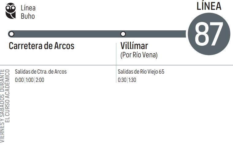 Línea 87: BÚHO Carretera de Arcos - Villímar. Itinerario Icono Mapa Consulta el Itinerario en Directo Horario Documents LINEA_87.pdf (pdf 23,8 kB)
