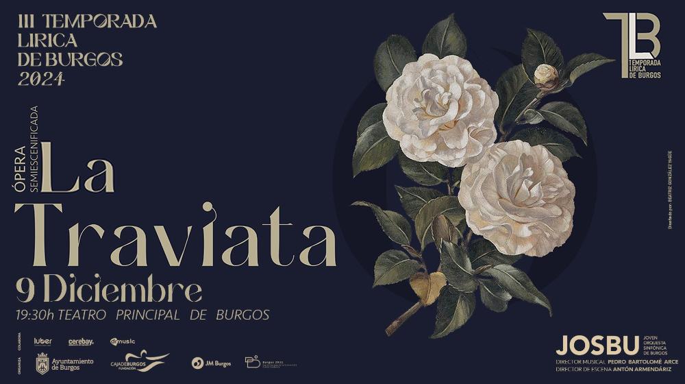 Lunes 9 de diciembre de 2024. 19:30 h. III TEMPORADA LÍRICA DE BURGOS 2024. JUVENTUDES MUSICALES DE BURGOS. ÓPERA (versión semiescenificada). “La Traviata” (Música: Giuseppe Verdi. Libreto: Francesco Maria Piave, basado en “La dama de las camelias” de Alejandro Dumas). Joven Orquesta Sinfónica de Burgos. Orfeón Burgalés (directora: Marta Pilar Hernando). Director musical: Pedro Bartolomé Arce. Director de escena: Antón Armendáriz. Traviata: Berna Perles (soprano). Alfredo: Alejandro del Cerro (tenor). Germont: Pablo López (barítono). Flora/Annina: Anna Gomà (soprano). Marchese/barone/dottore: Javier Agudo (bajo barítono). Gaston/Giuseppe/comisario: Manuel de Diego (tenor). Teatro Principal de Burgos. Zona A: 20 €, Zona B: 16 €, Zona C: 10 €, Zona D: 8 € (+ comisión de venta por internet). Programación conjunta Fundación Caja de Burgos y Ayuntamiento de Burgos. Duración aproximada: 20 h. 20 min. (incluido descanso)