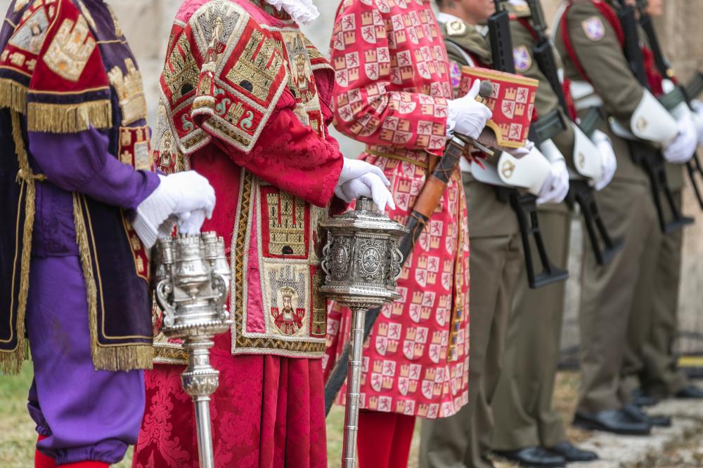 Su impresionante vestuario escarlata trae al recuerdo tiempos pasados, pues van ataviados con sedas, terciopelos, puntillas, plumas y grandes bordados en oro y plata. Portan sobre sus hombros mazas de plata repujada.
