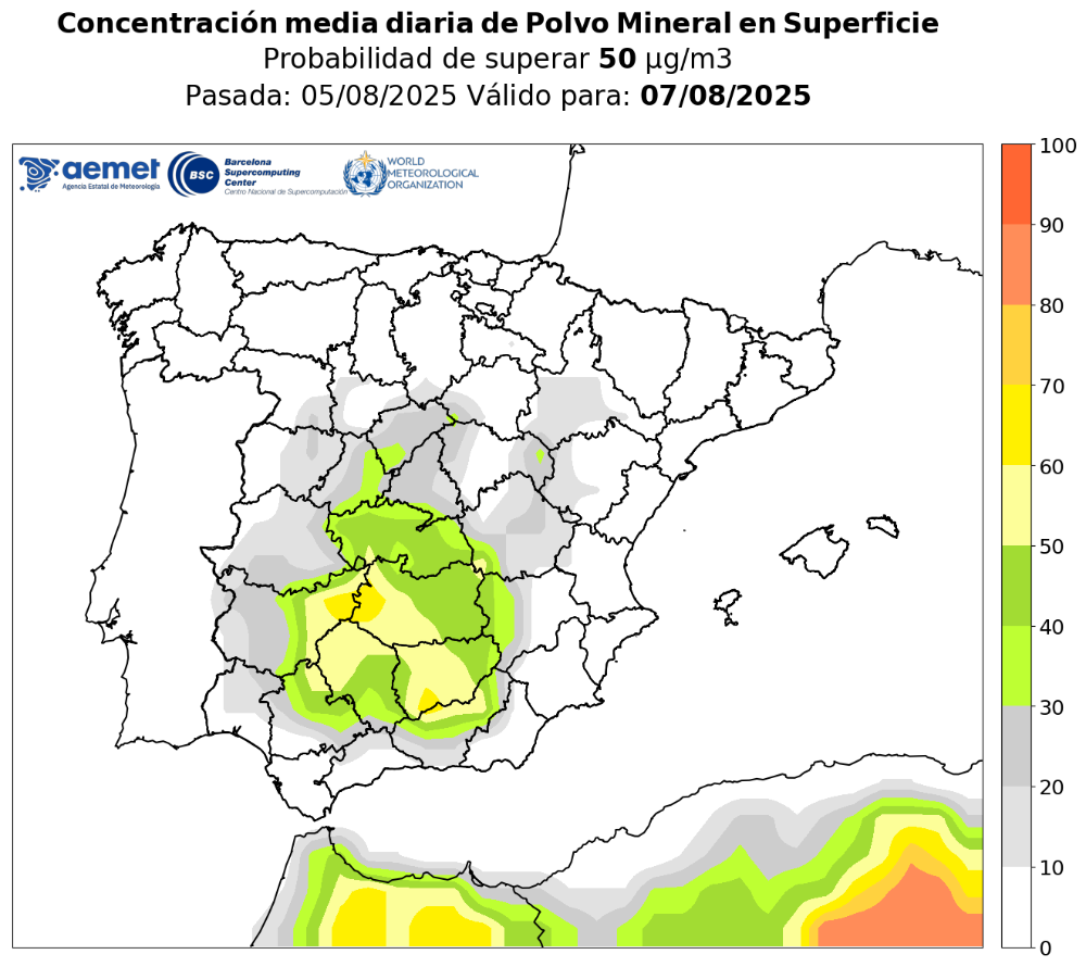 Los modelos de predicción anuncian la intrusión de partículas de polvo procedentes del norte de África y que, previsiblemente, provocarán un aumento de los niveles medidos de estas sustancias en el aire para mañana miércoles, 6 de agosto, y los siguientes días y que afectará a todo el territorio de Castilla y León. Se trata de un proceso absolutamente natural sobre el que no cabe intervención humana, salvo la adopción de precauciones para minimizar la exposición a este tipo de partículas.