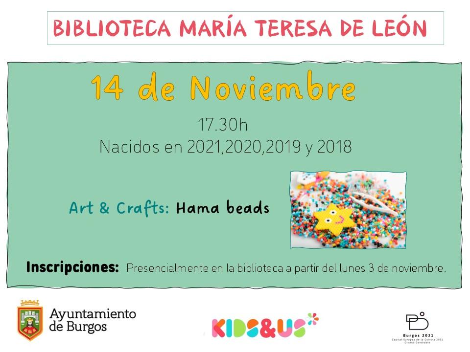 El viernes 14 de noviembre se desarrollará el talleren inglés "Art & Crafts: Hama beads" en la Biblioteca María Teresa León a las 17:30 h..