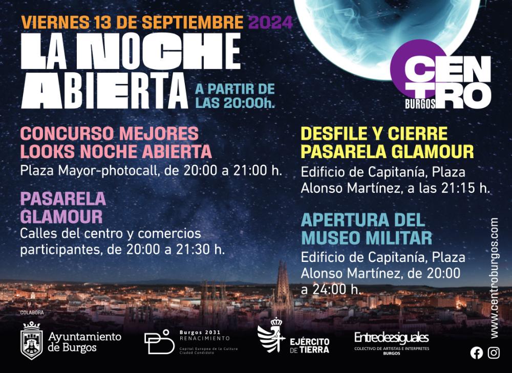 La Asociación de Comerciantes Centro Burgos organiza la NOCHE ABIERTA, donde los comercios abren sus puertas a partir de las 20.00 h para presentar la campaña otoño invierno 24/25, con sorpresas, descuentos y promociones únicas, acompañado de concursos, desfiles, DJ´s, talleres, actuaciones....