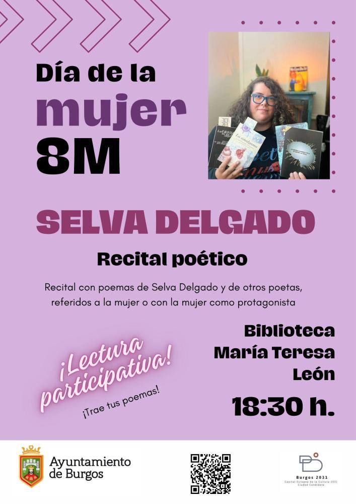 El próximo día 8 de marzo a las 18:30 h., Selva Delgado ofrece un recital poético en la Biblioteca María Teresa León para celebrar el Día de la Mujer.