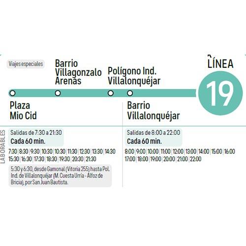 Línea 19: Plaza Mío Cid - Villagonzalo Arenas - Pol. Ind. Villalonquéjar - Barrio Villalonquéjar Itinerario Icono Mapa Consulta el Itinerario en Directo Horario Documents LINEA_19.pdf (pdf 31 kB)